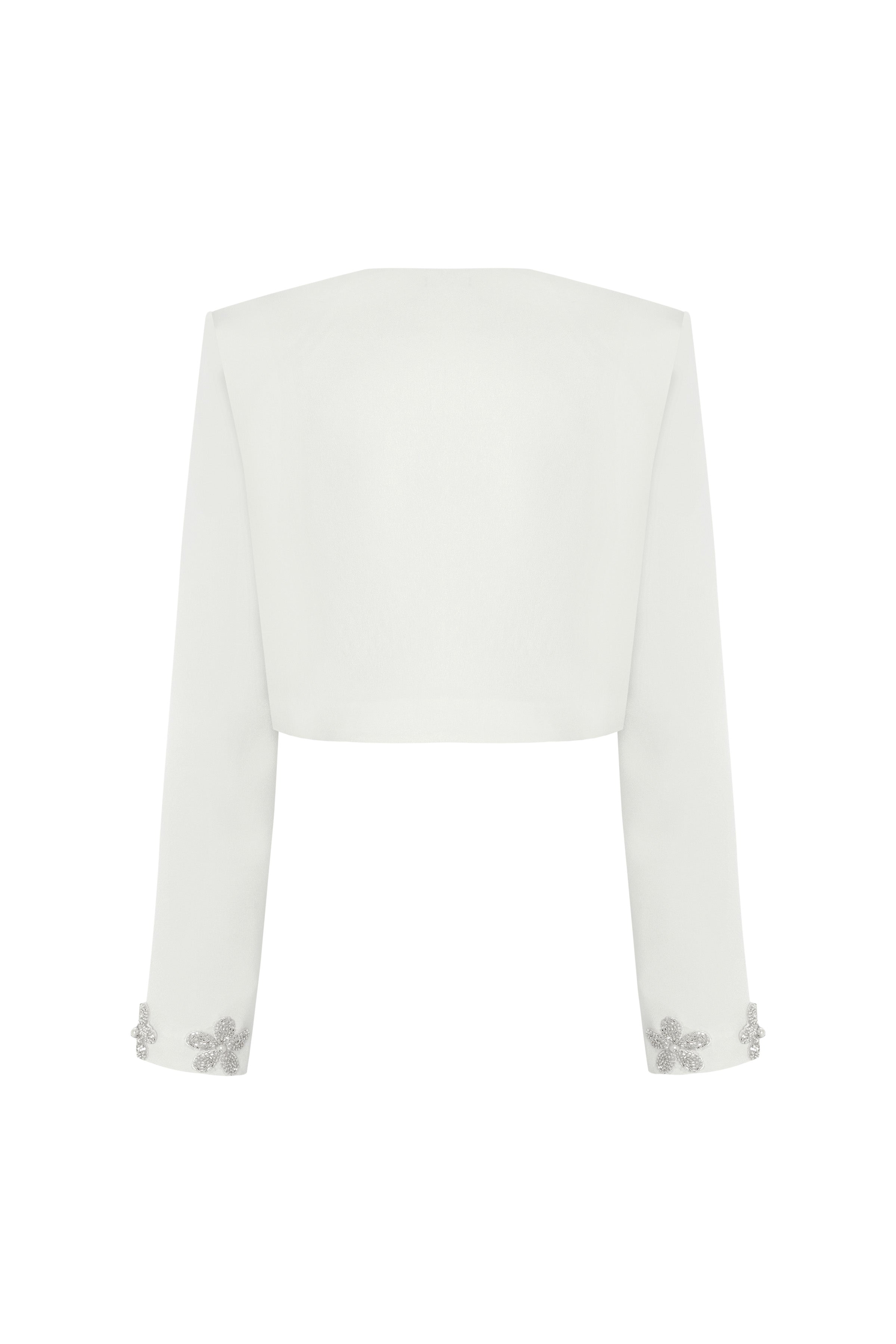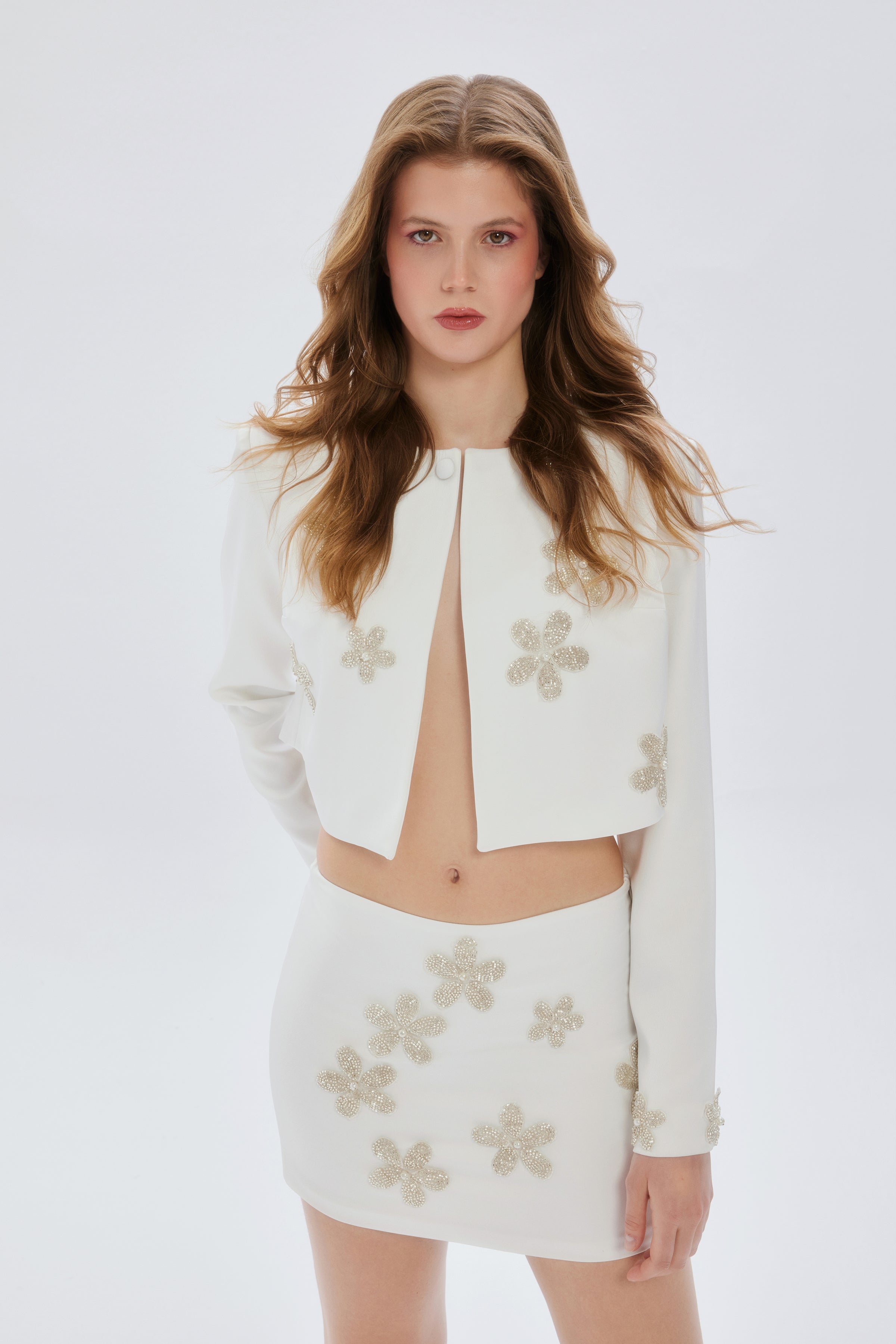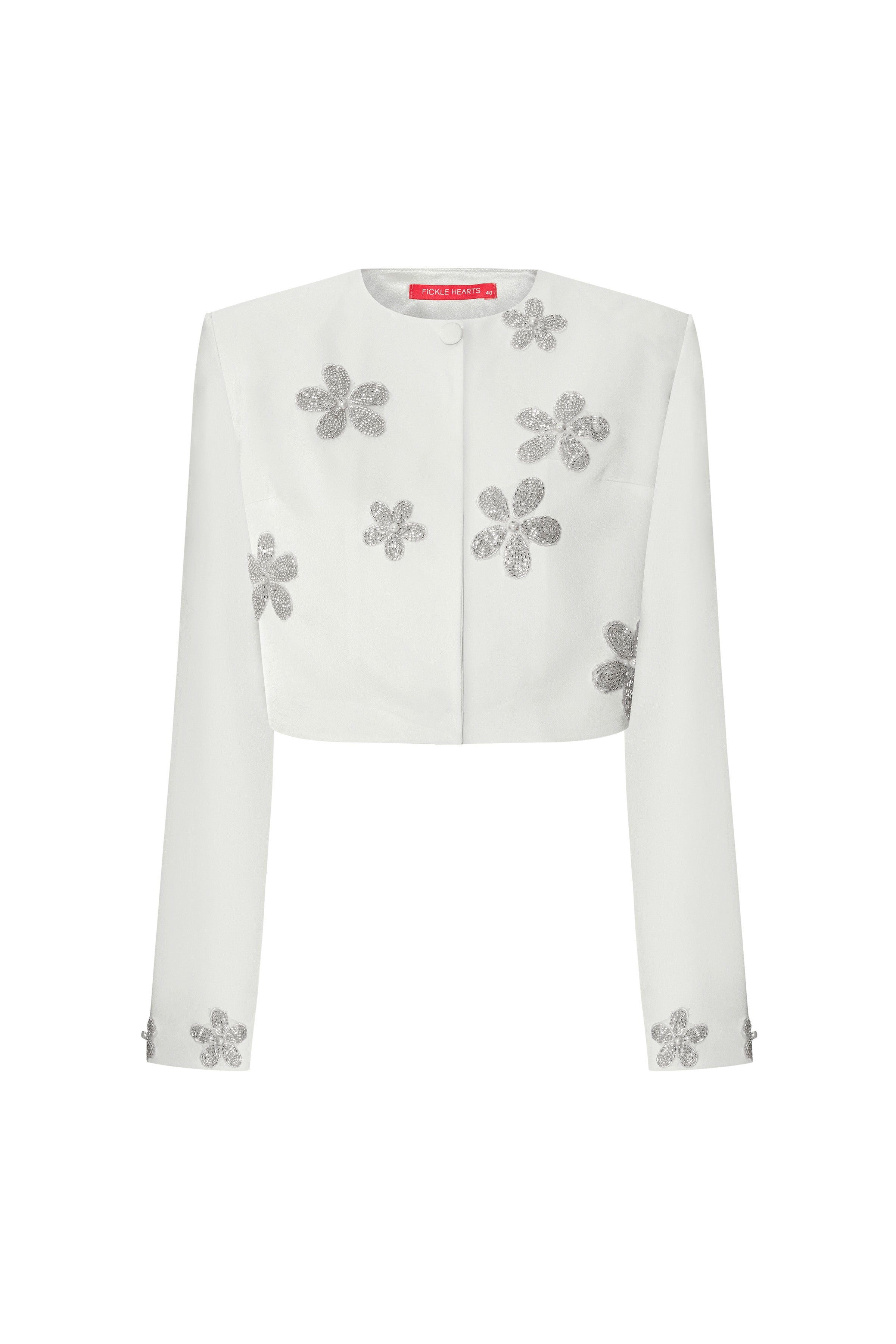 Matt Italian Satin meets silver flower emrodiery, Darya Mini Jacket is the white coral of the Realm of Mythical City of Atlantis