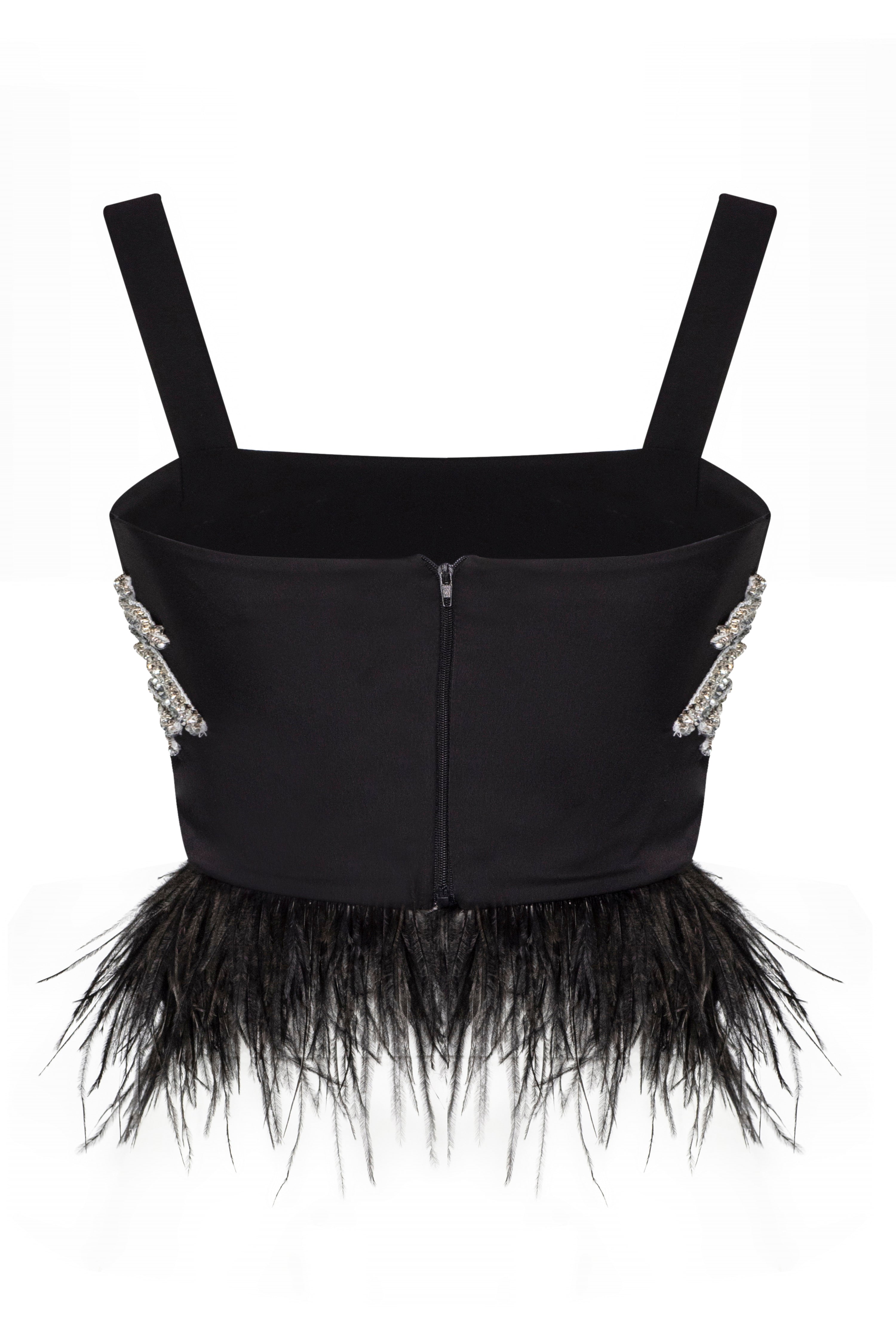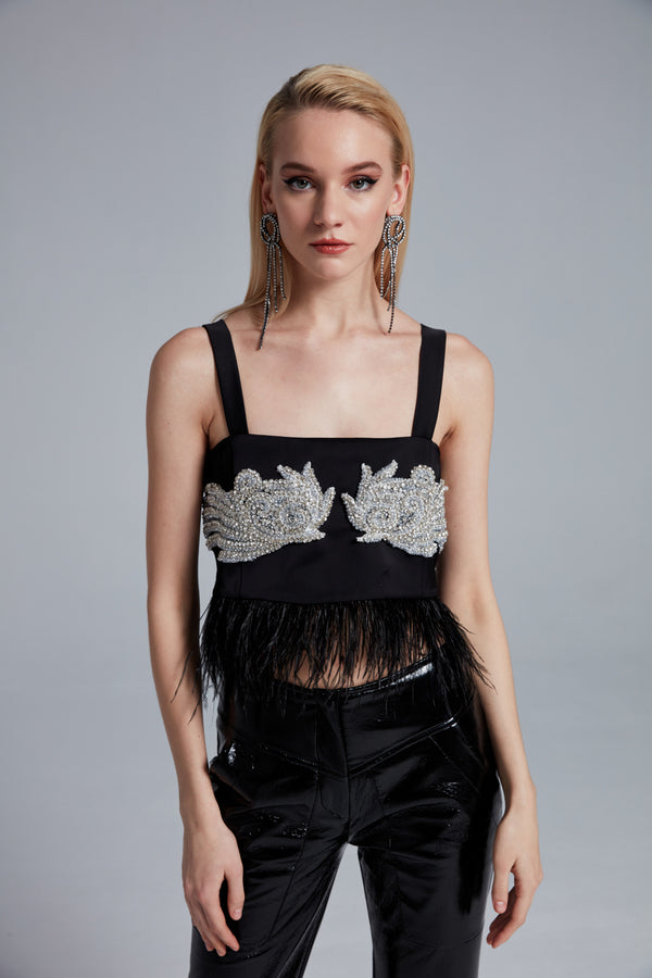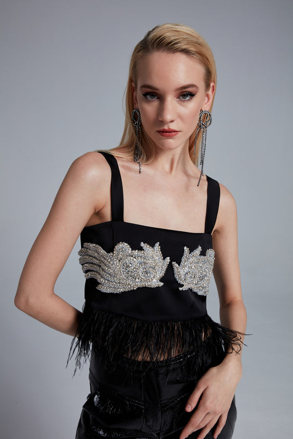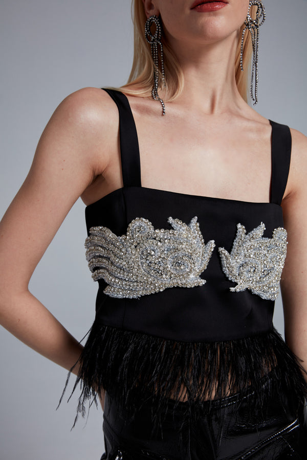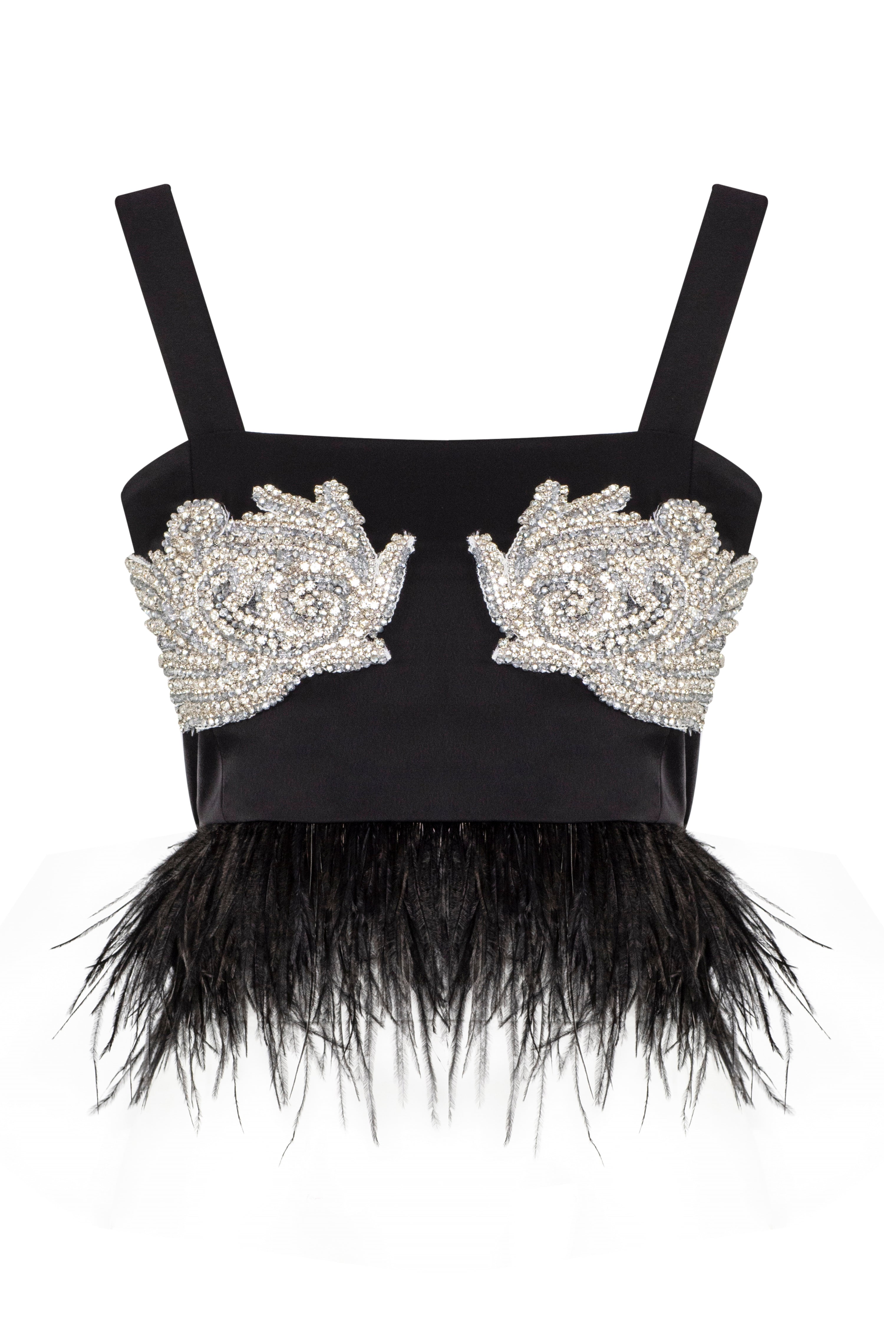 Double layer matte Italian satin fabric hem finished with feather, hand embroidered stone details