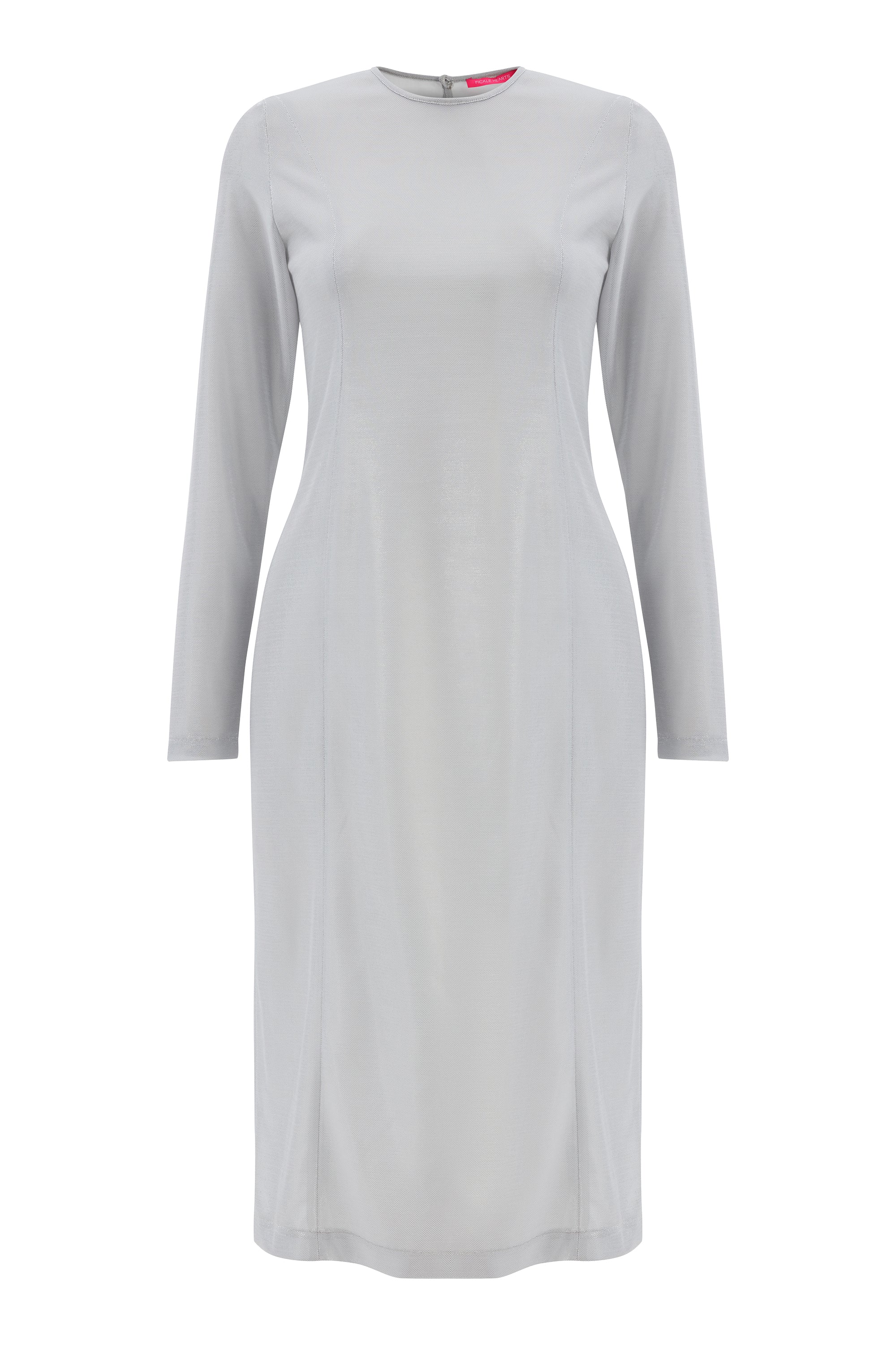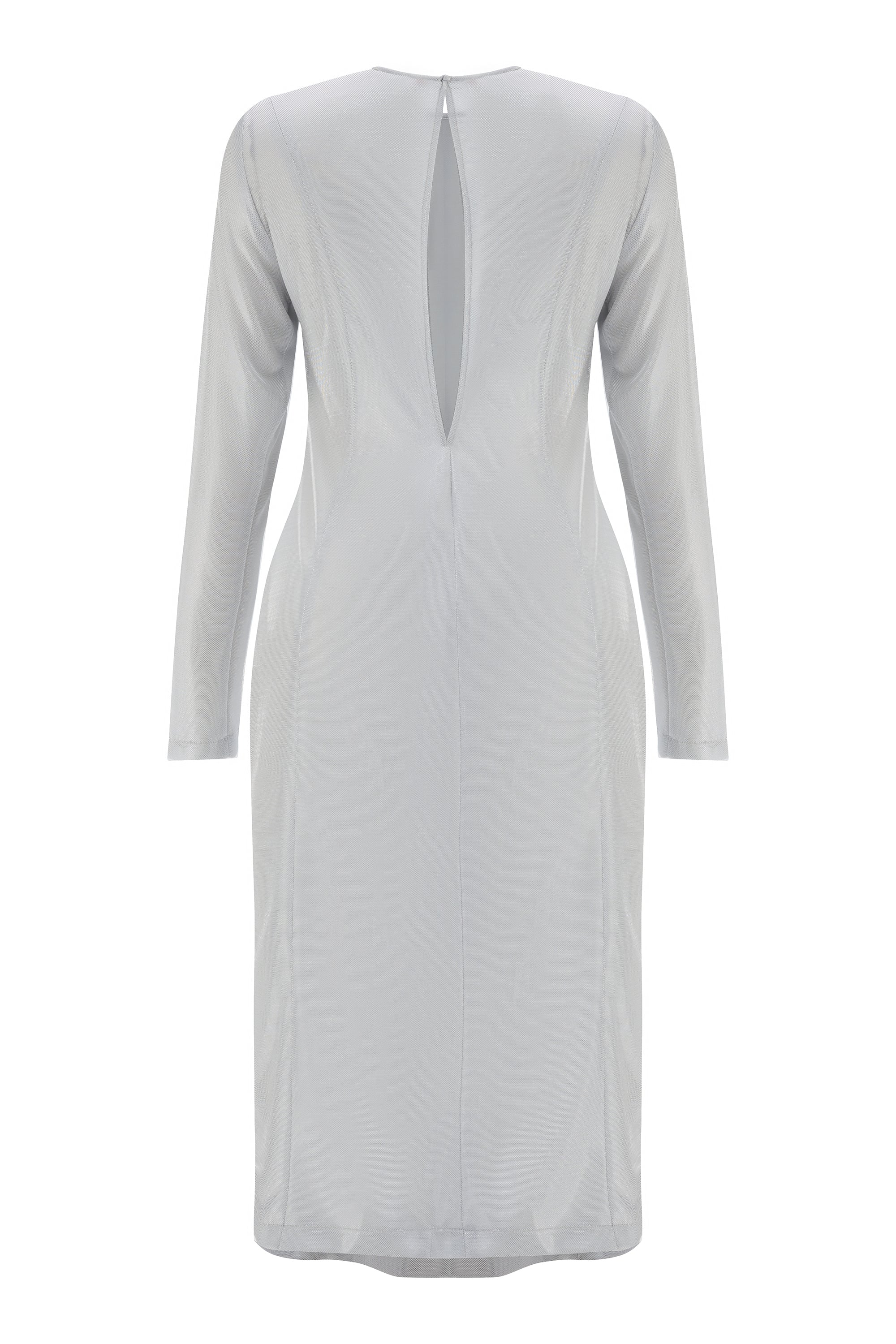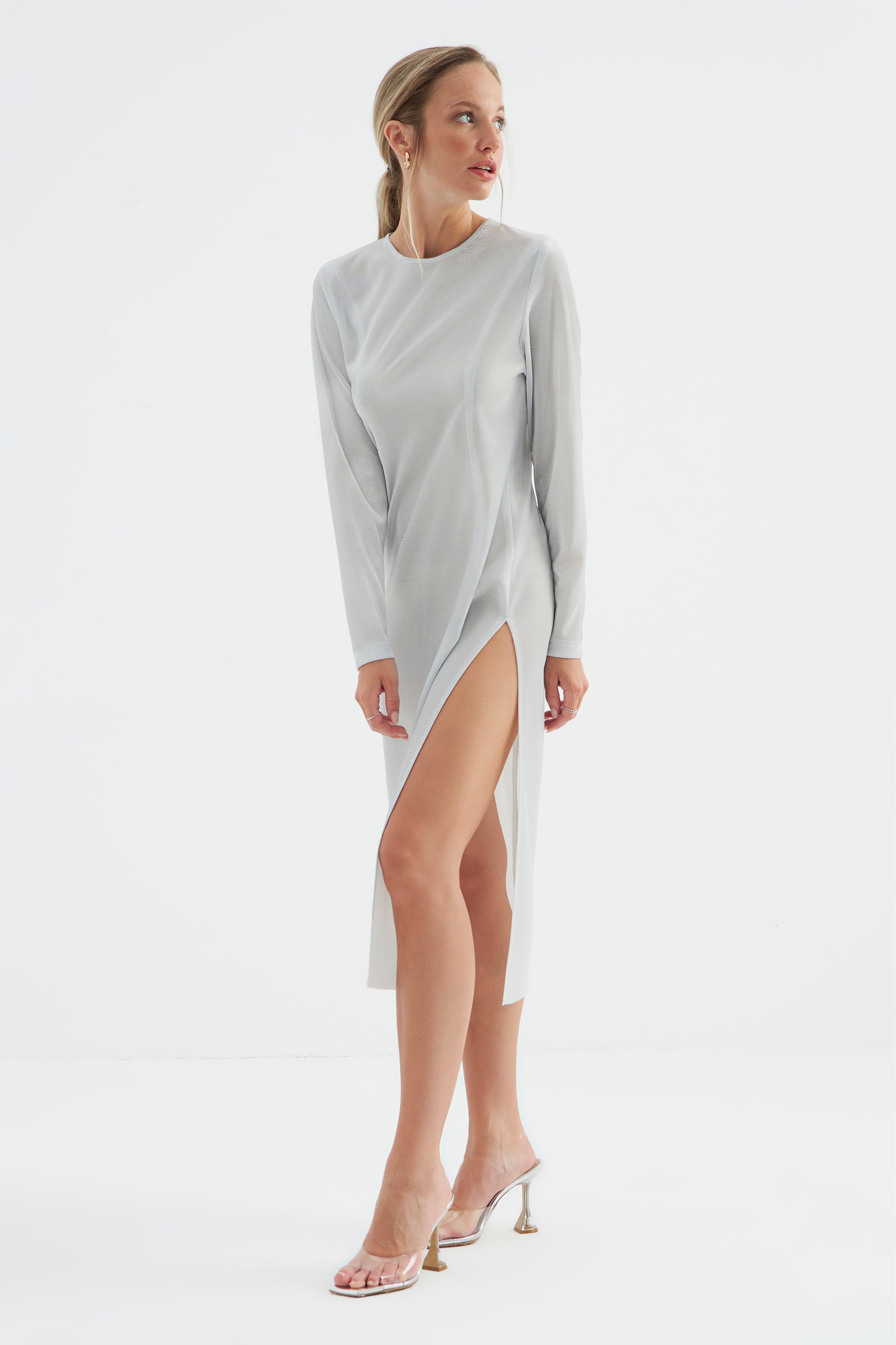 Gümüş Uzun Kollu Derin Yırtmaçlı Elbise
