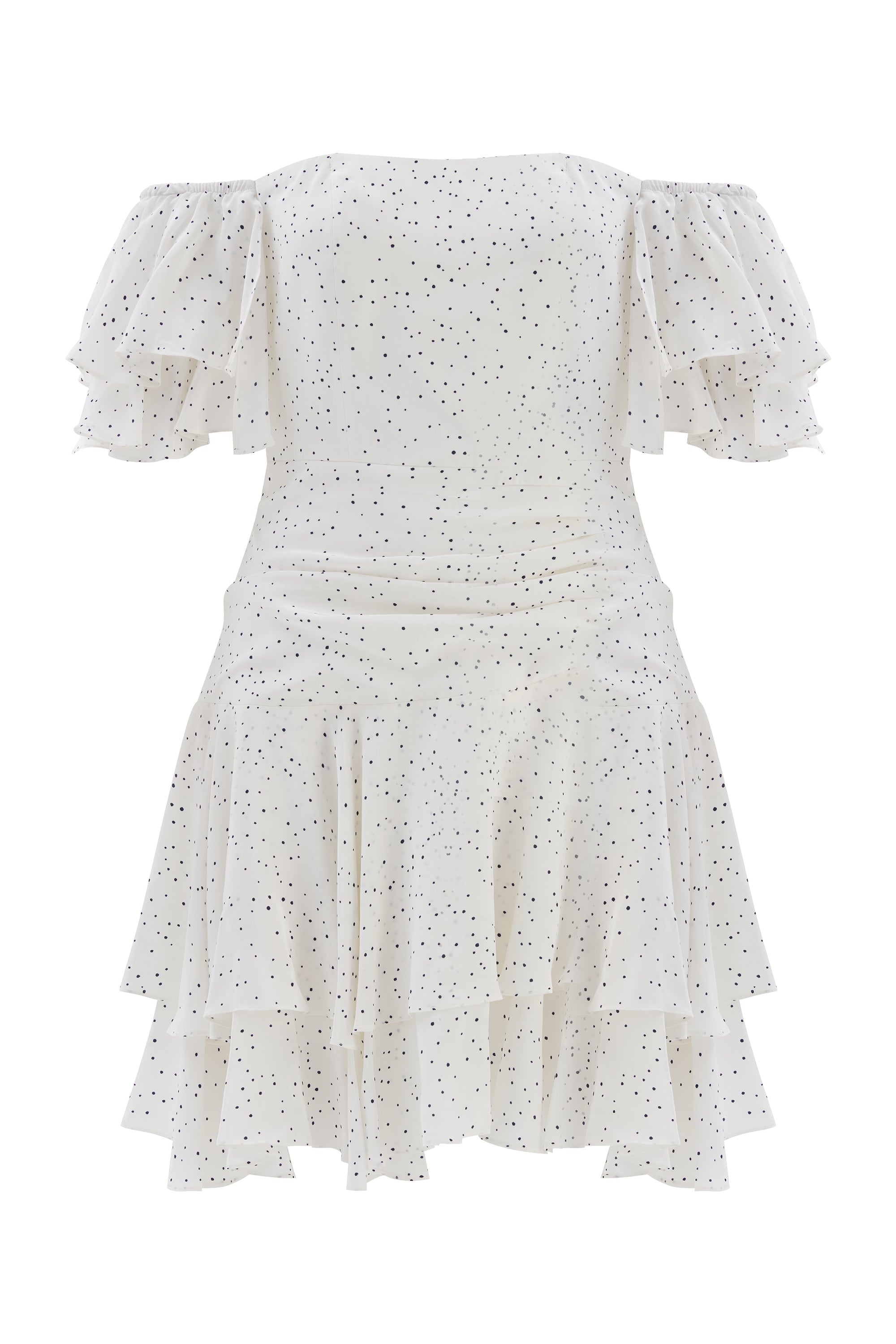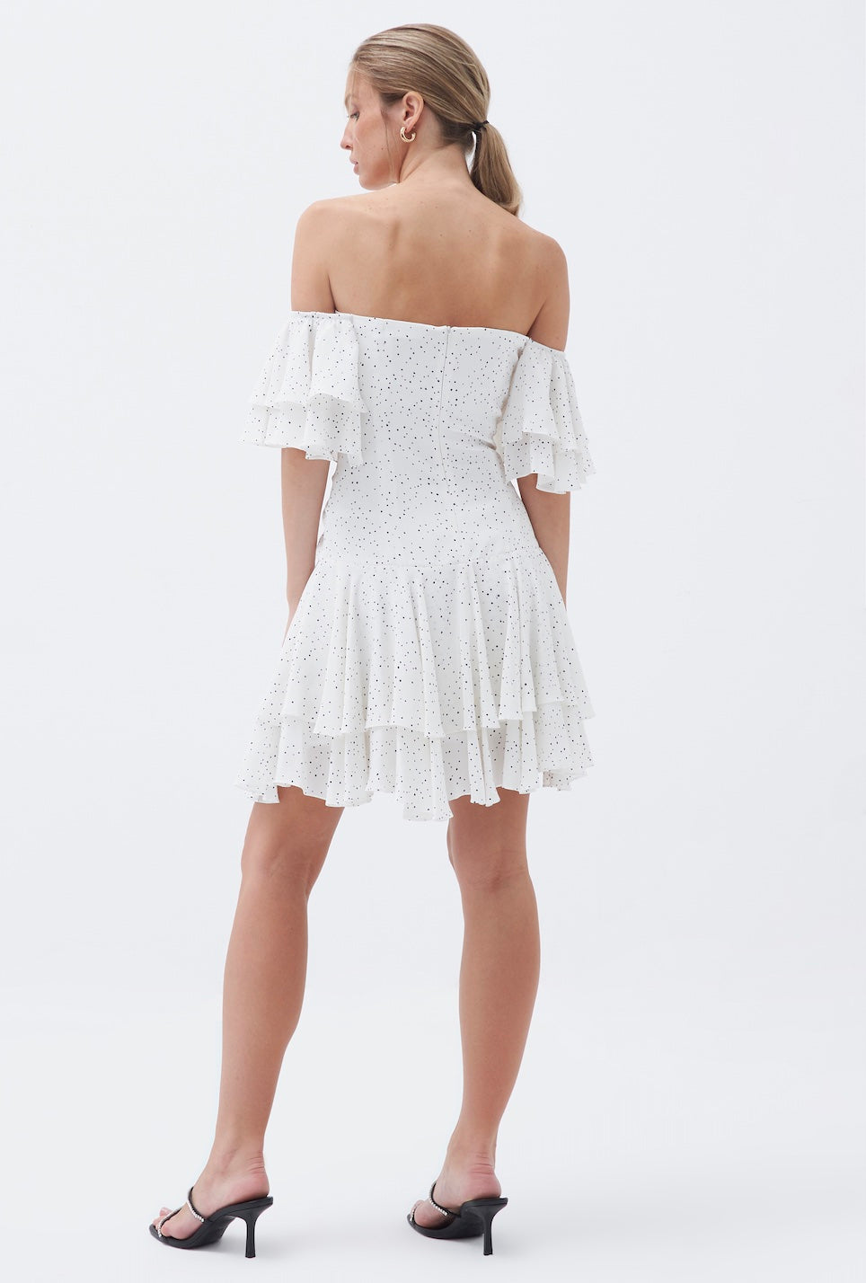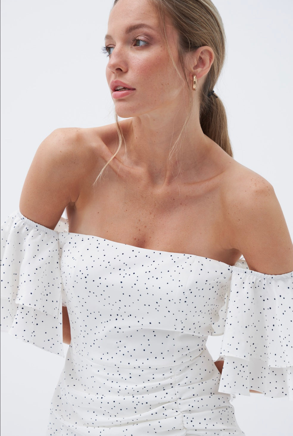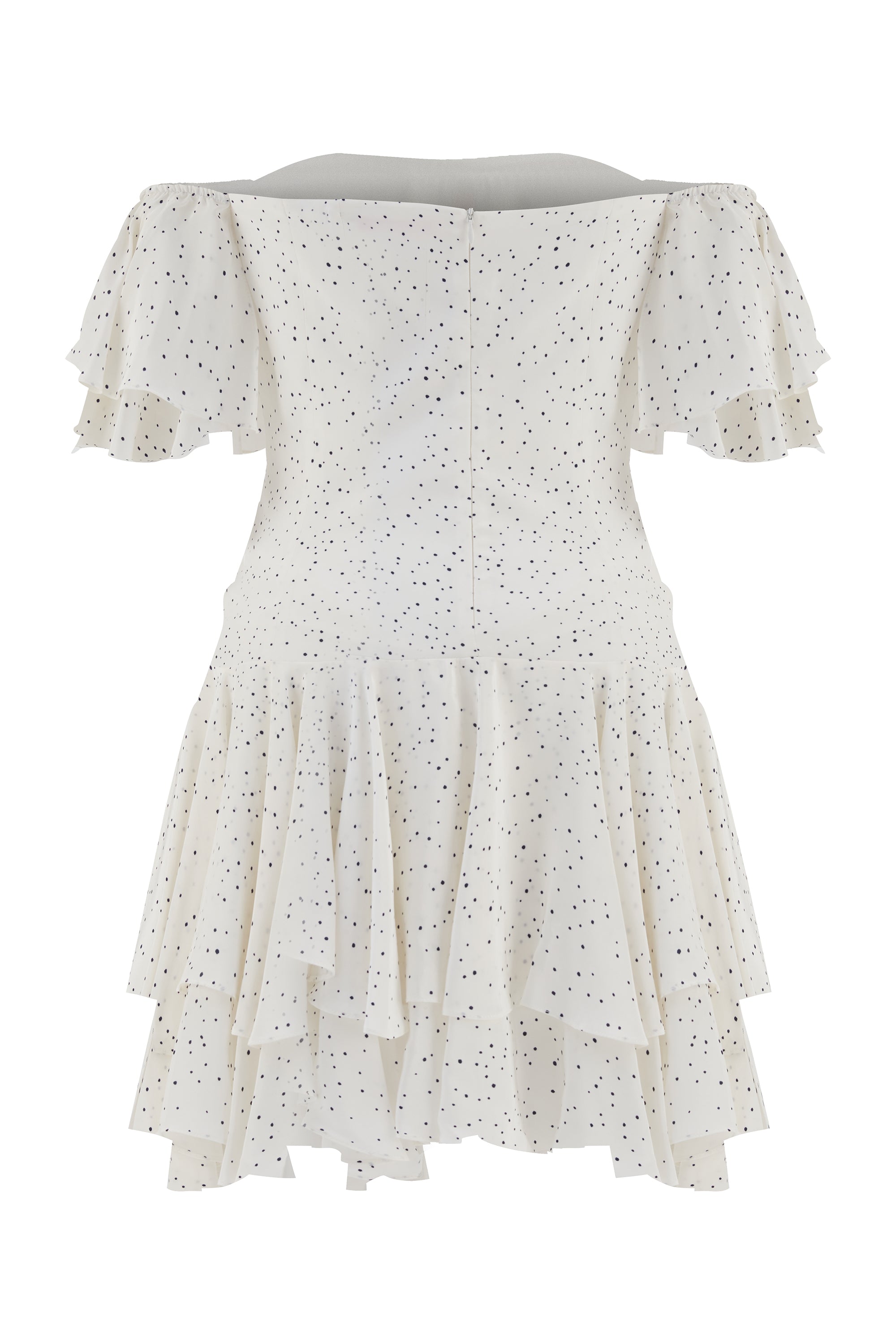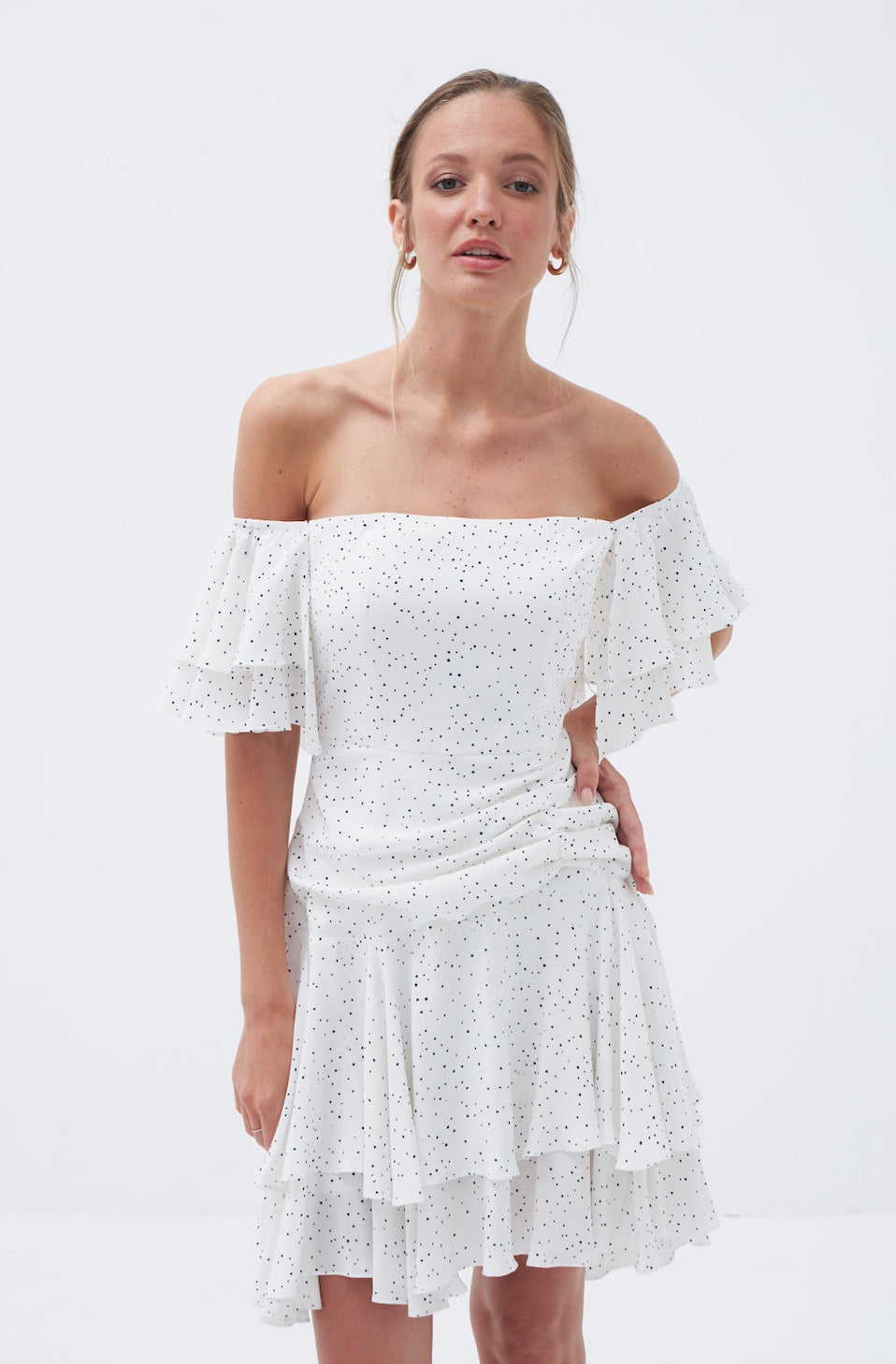 Bella düşük omuzlu, ipek floş elbise