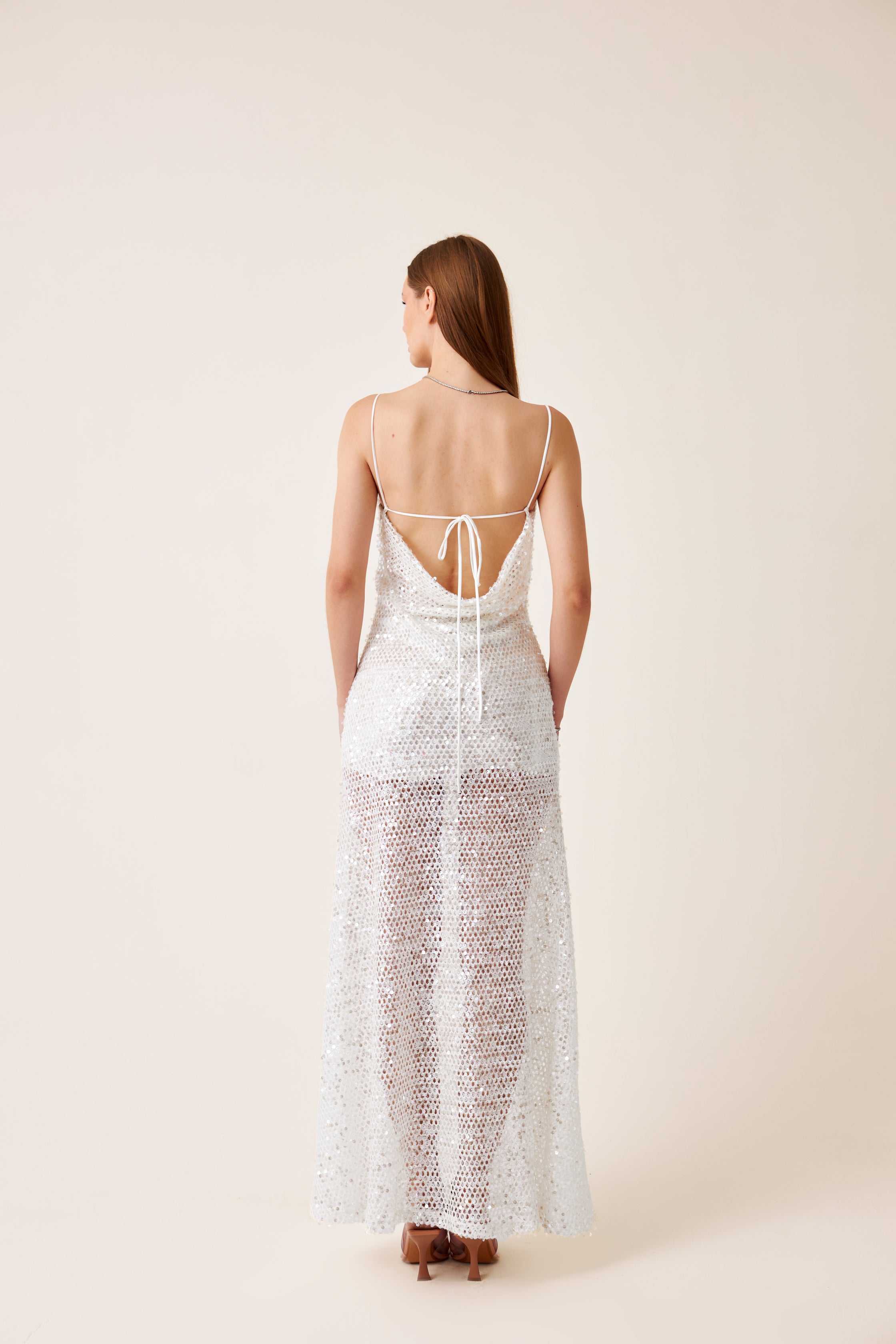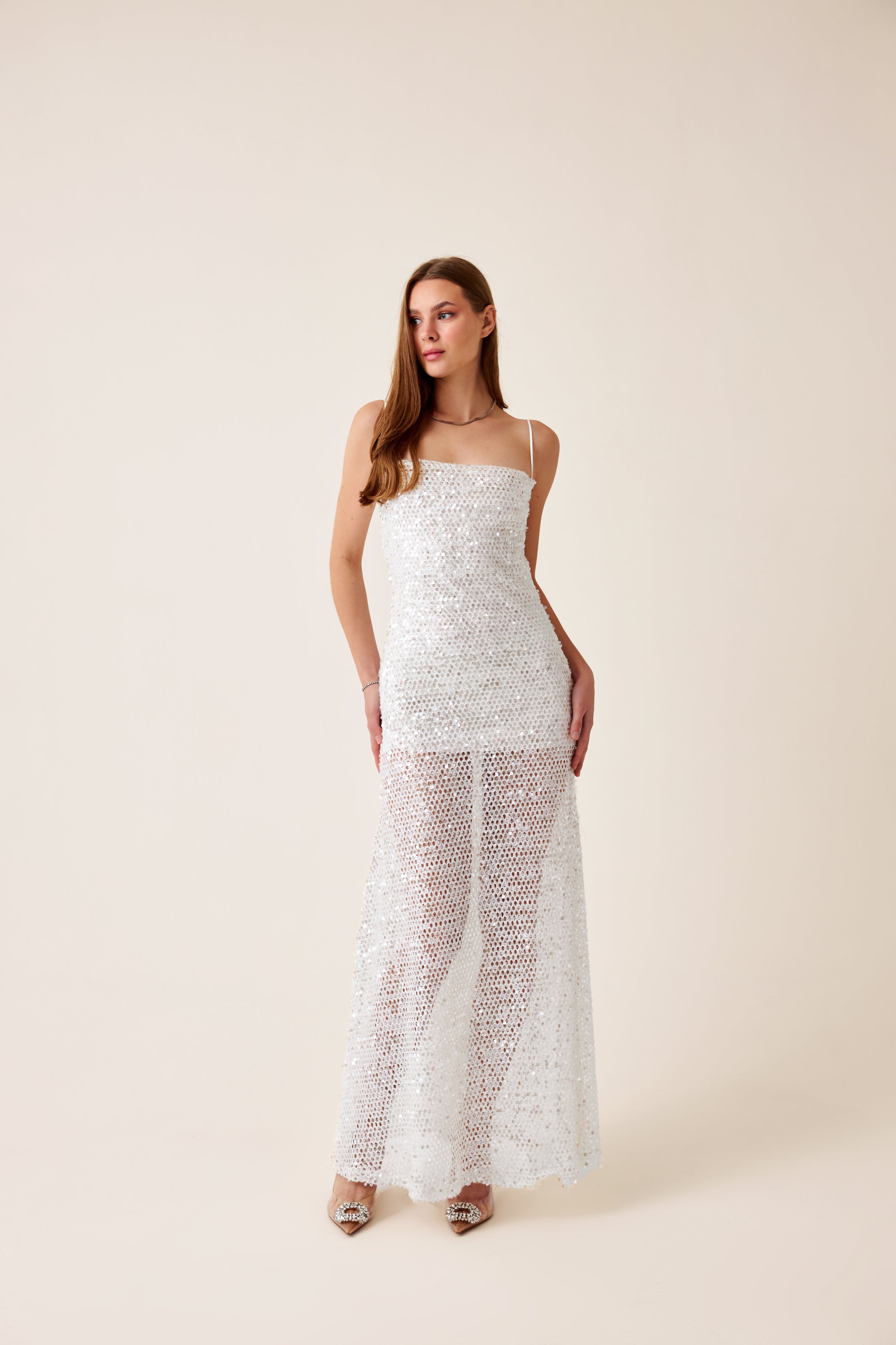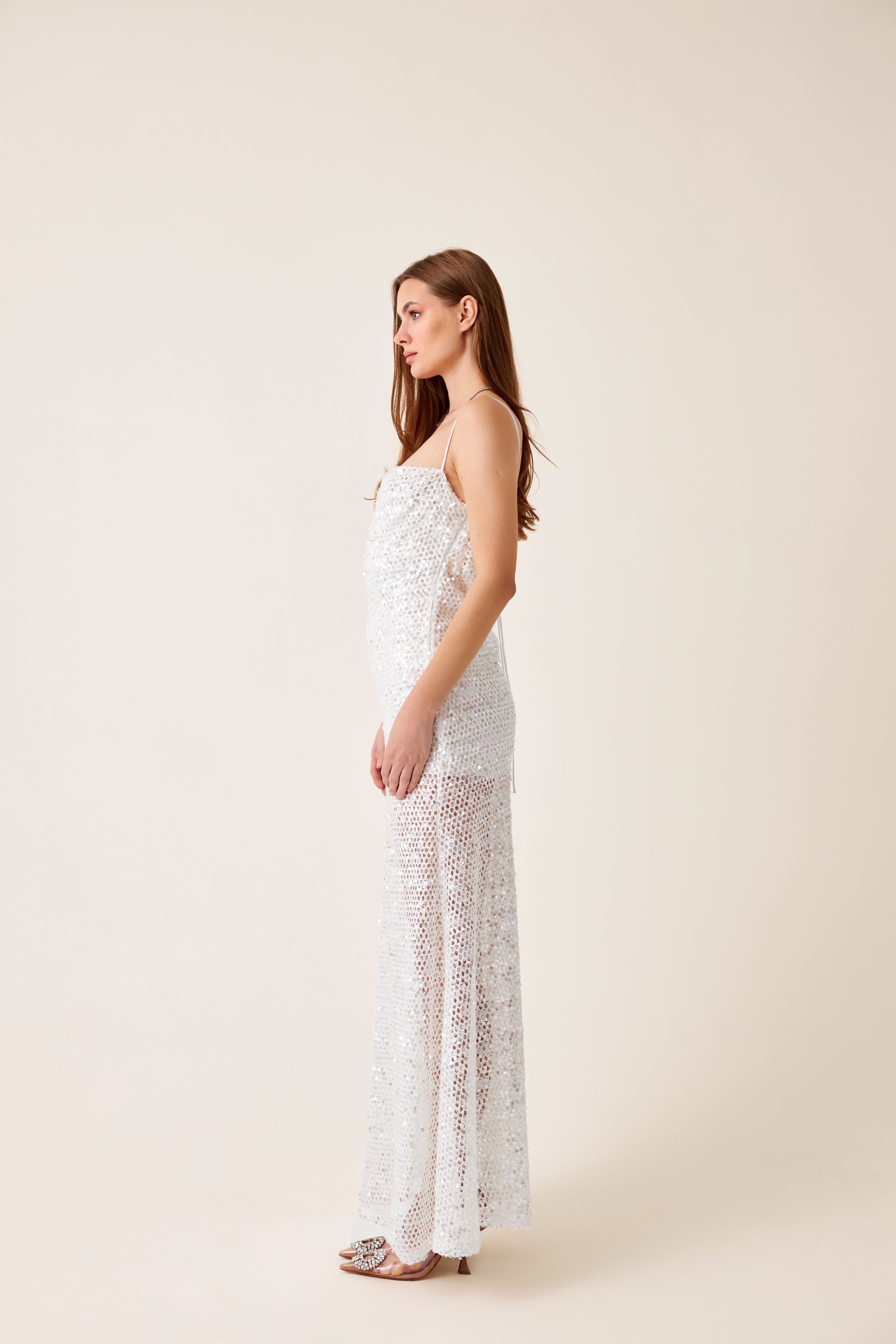 Beyaz file kumaş üstü payet işlemeli kumaş, ipek saten astarlı, yaka ve sırt degaje detaylı maxi elbise