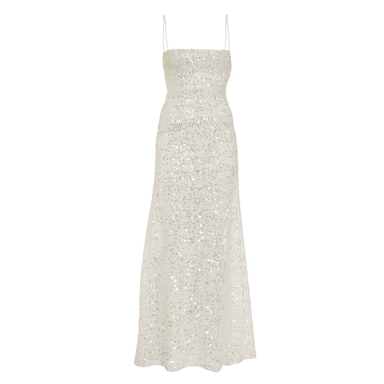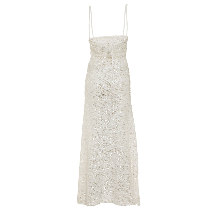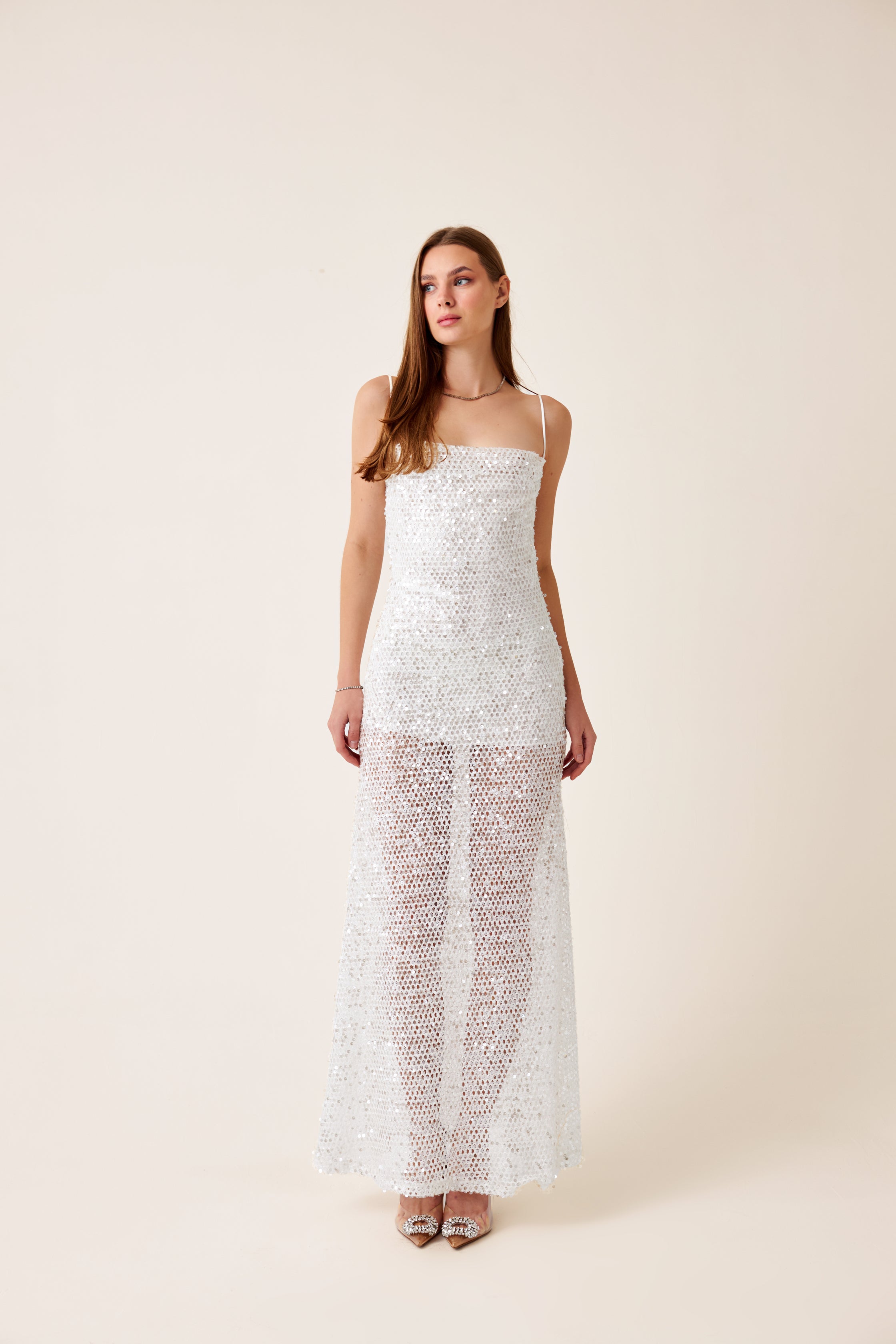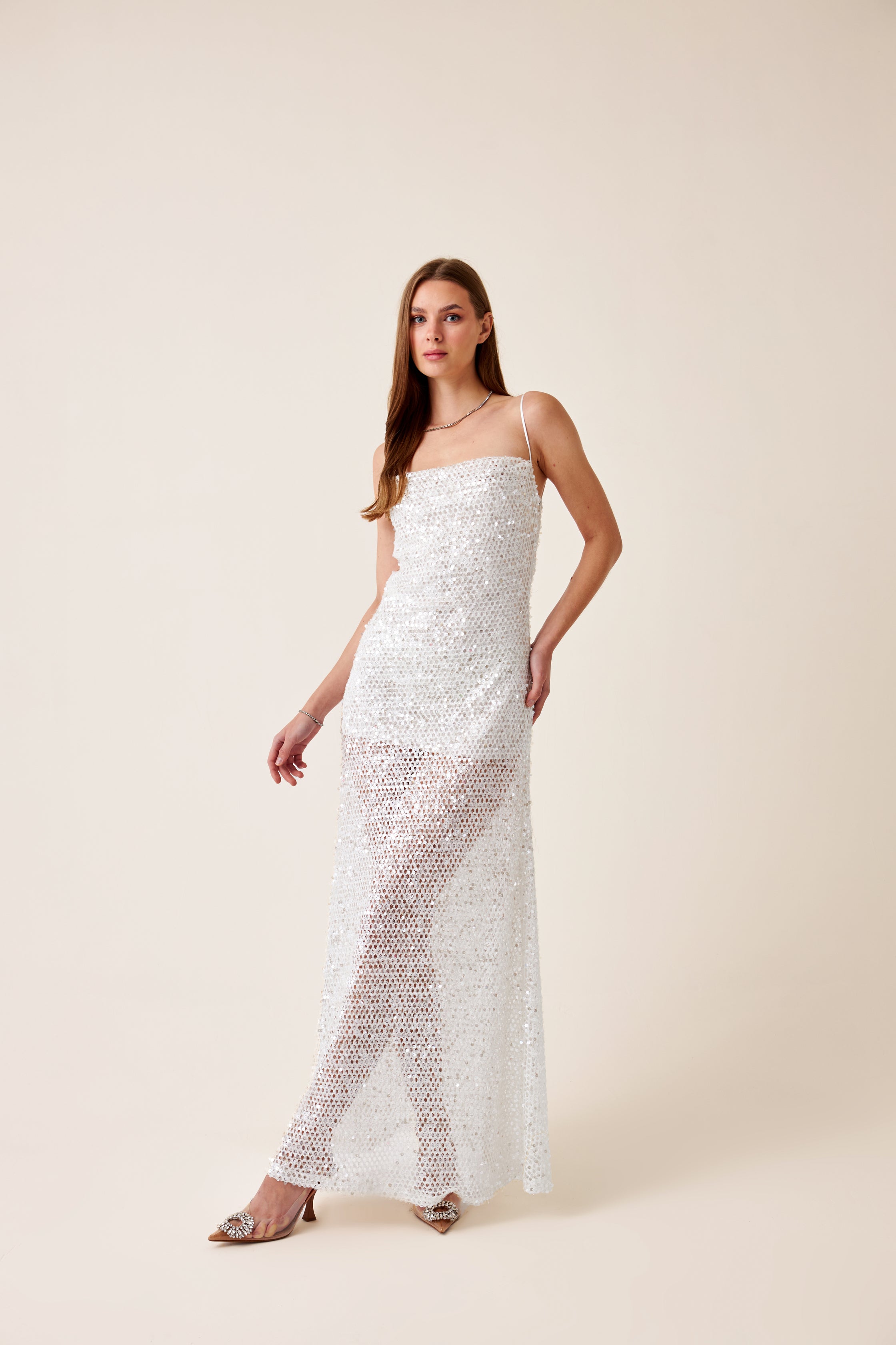 Beyaz file kumaş üstü payet işlemeli kumaş, ipek saten astarlı, yaka ve sırt degaje detaylı maxi elbise