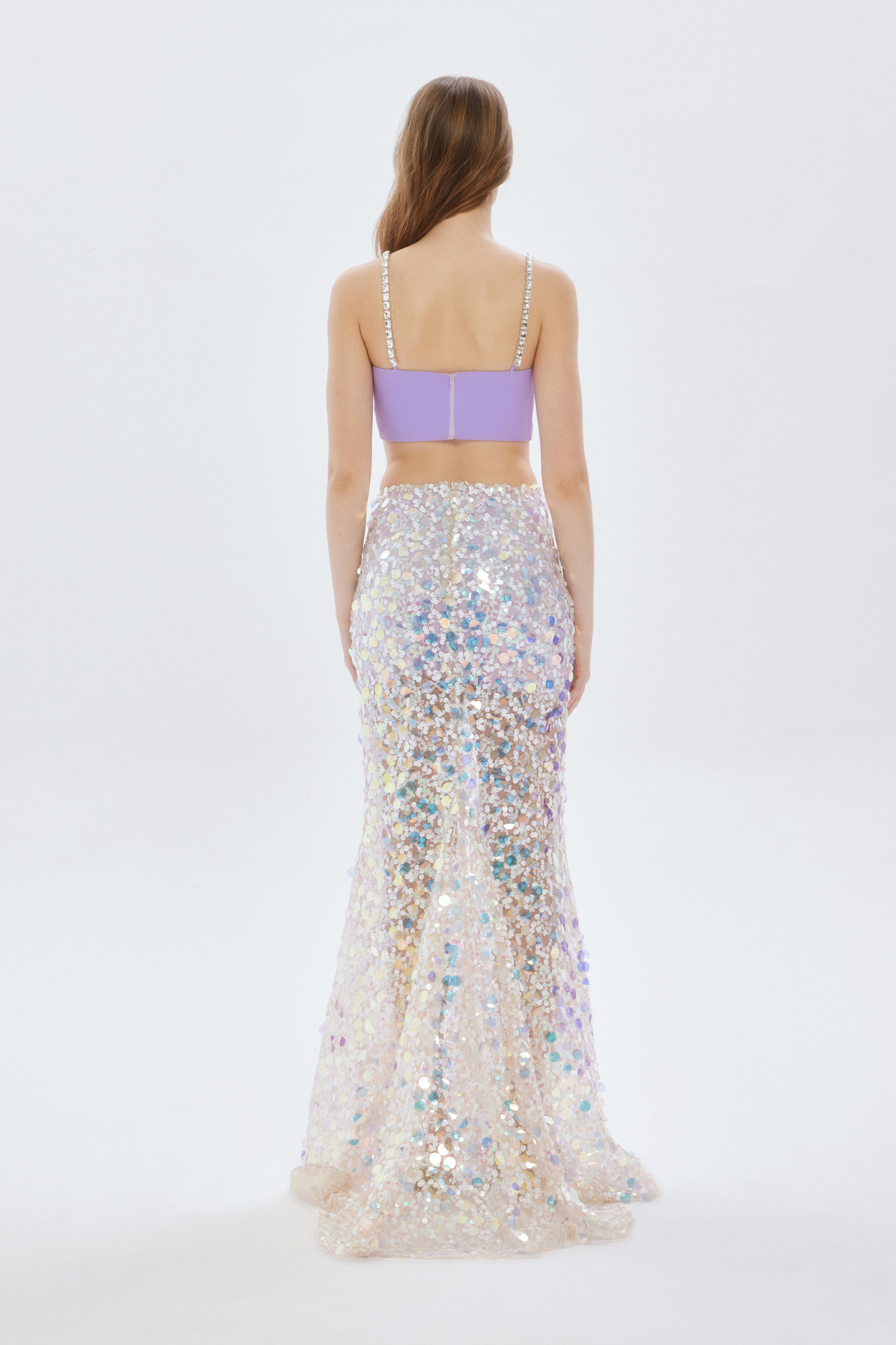 Etek kısmı: %100 PES lila yansımalı payet kumaş, likra astarı ve ön kısmında derin yırtmaç, arka kısmında balık formunda kuyruk detayıyla hem göz alıcı hem de konforlu bir tasarım sunar.