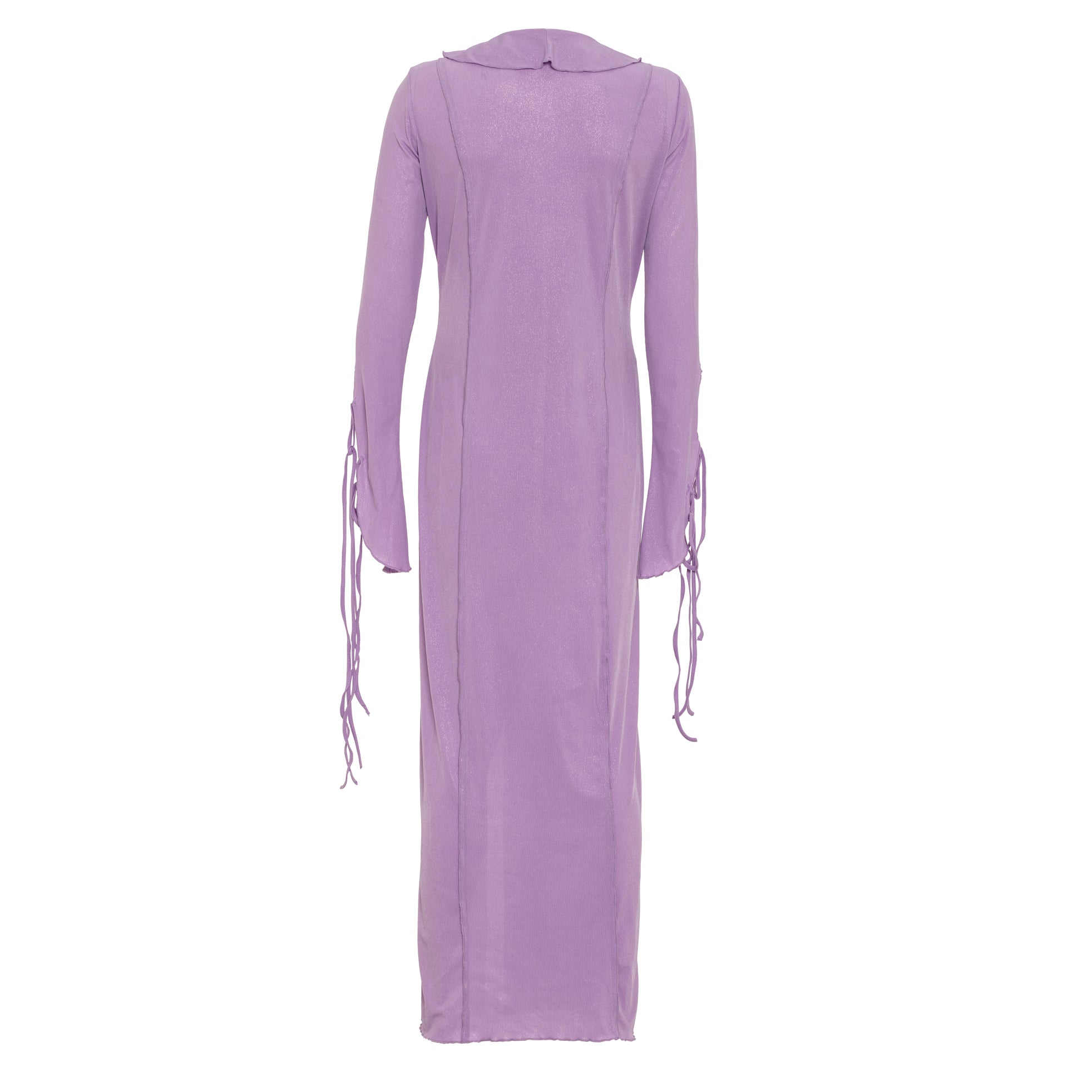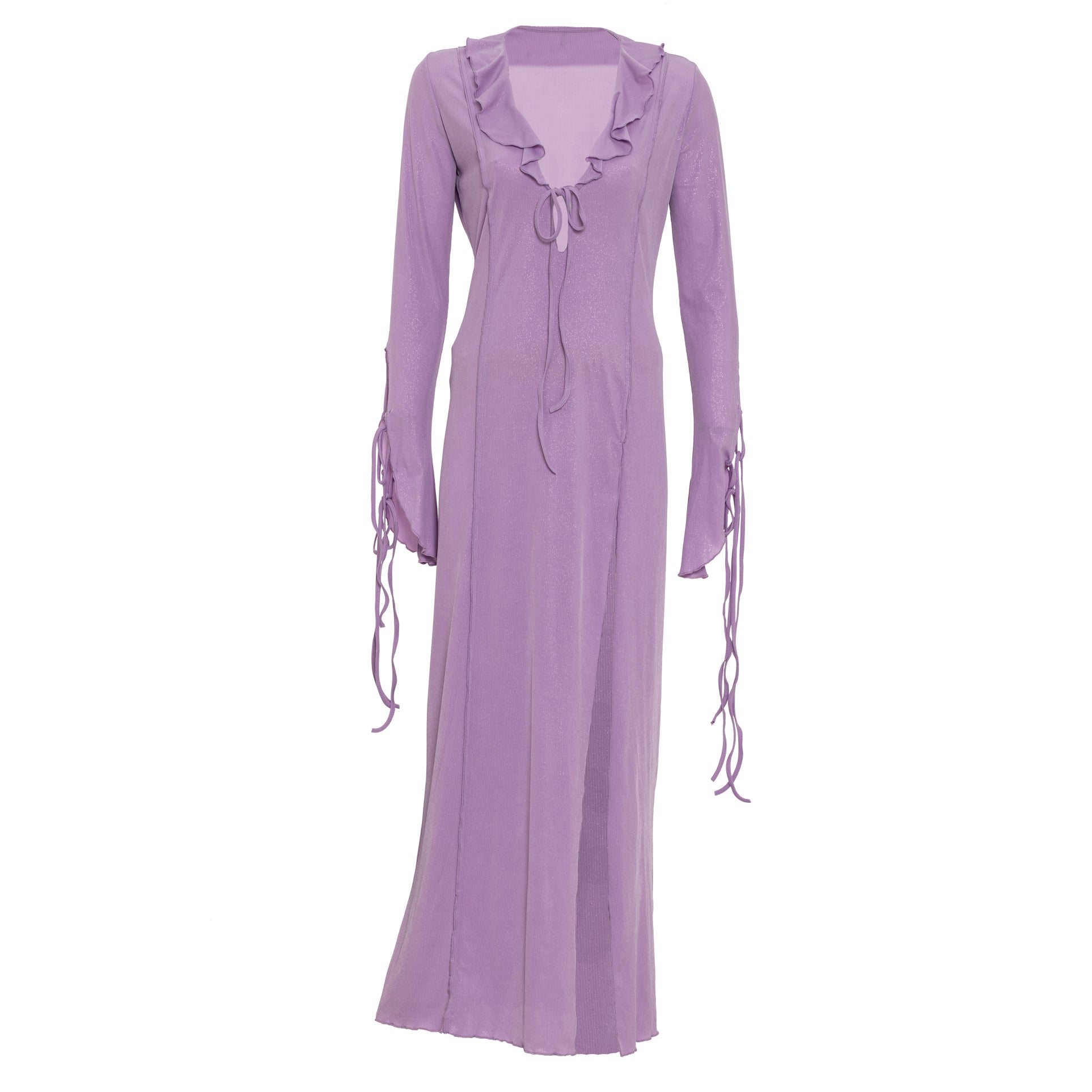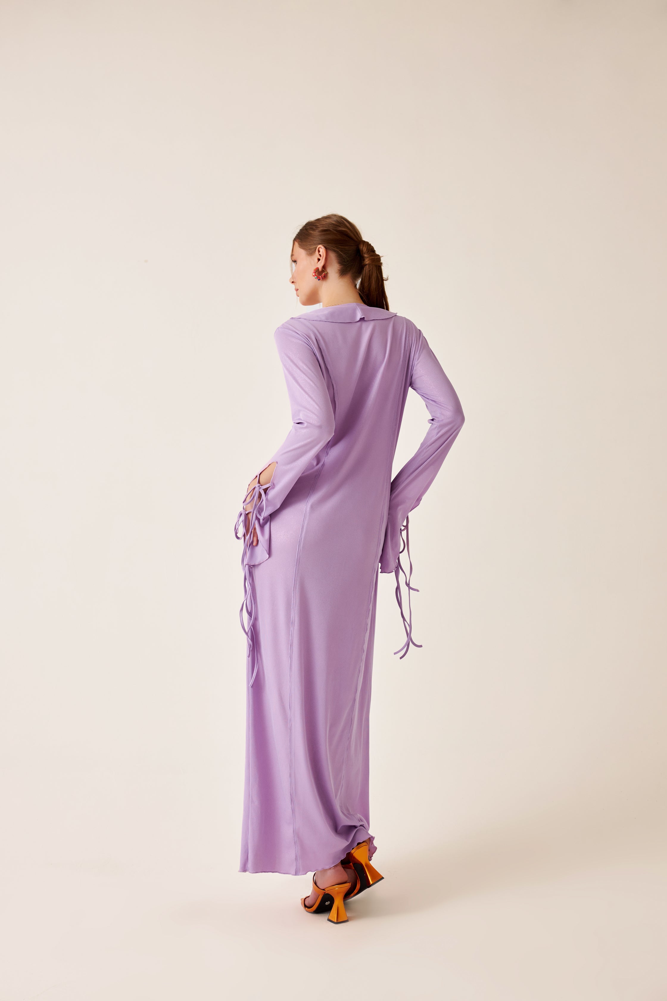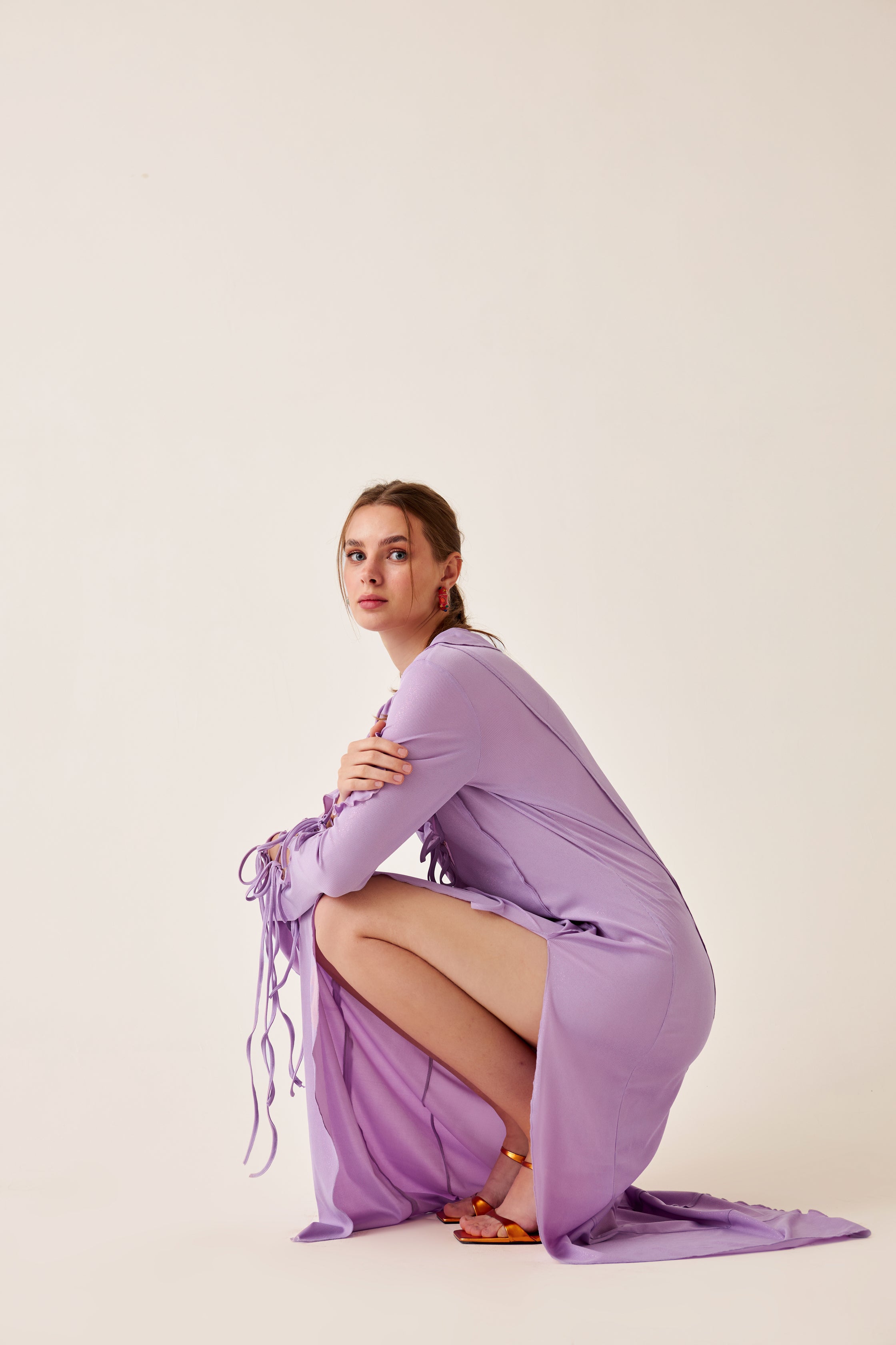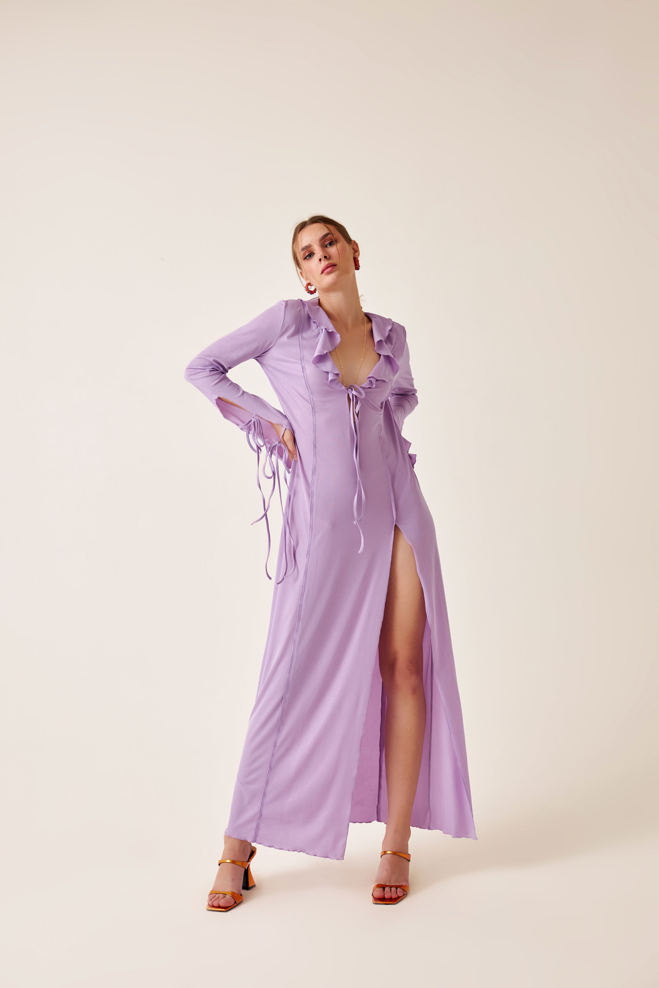 Örme kumaş lila rengi, fırfır ve bağcık detaylı derin V yaka ve derin yırtmaçı uzun kollu elbise